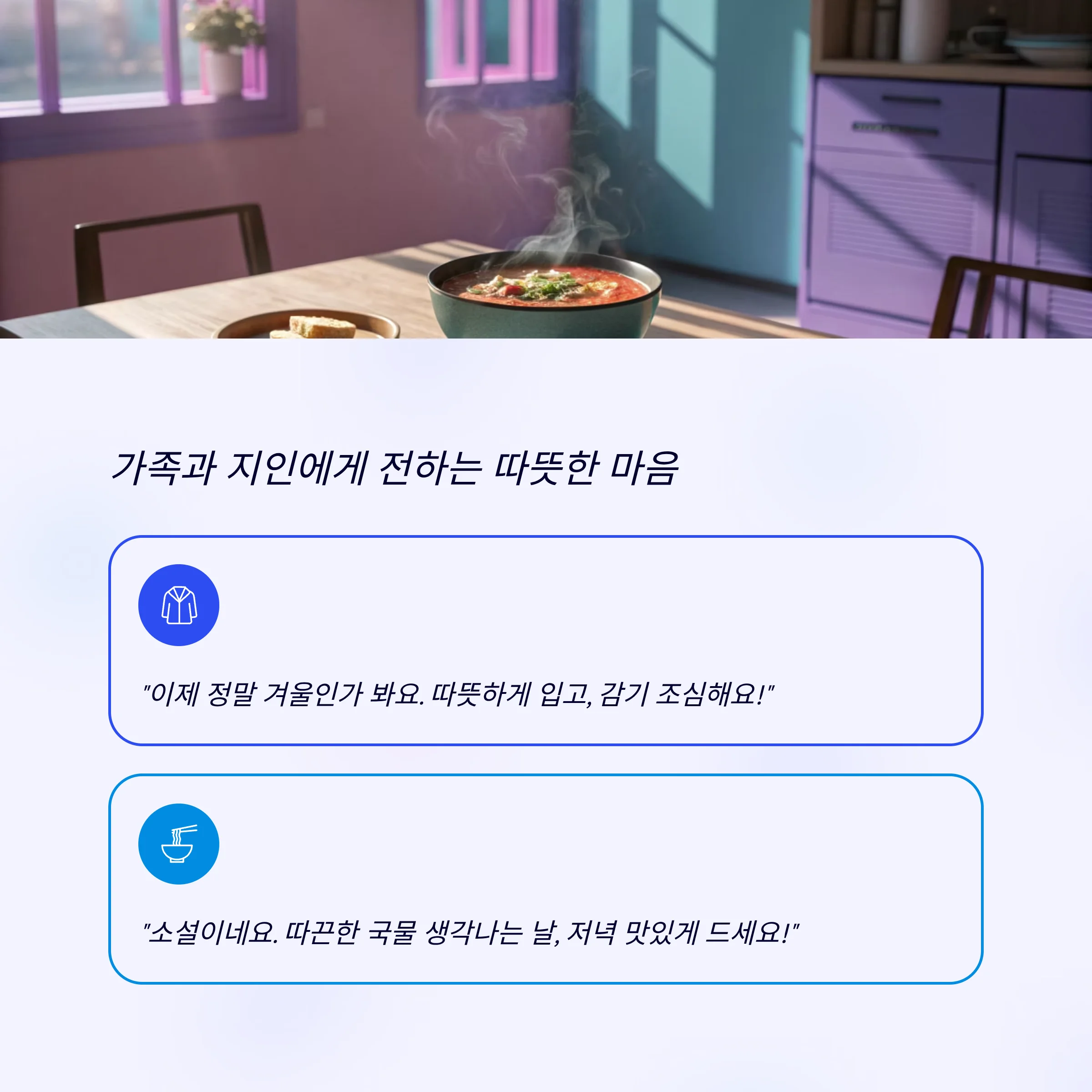"소설의 찬 바람 속에서도, 당신의 하루는 온기 가득하길 바랍니다." 라는 문구를 카드나 이미지 속에 담아보세요.