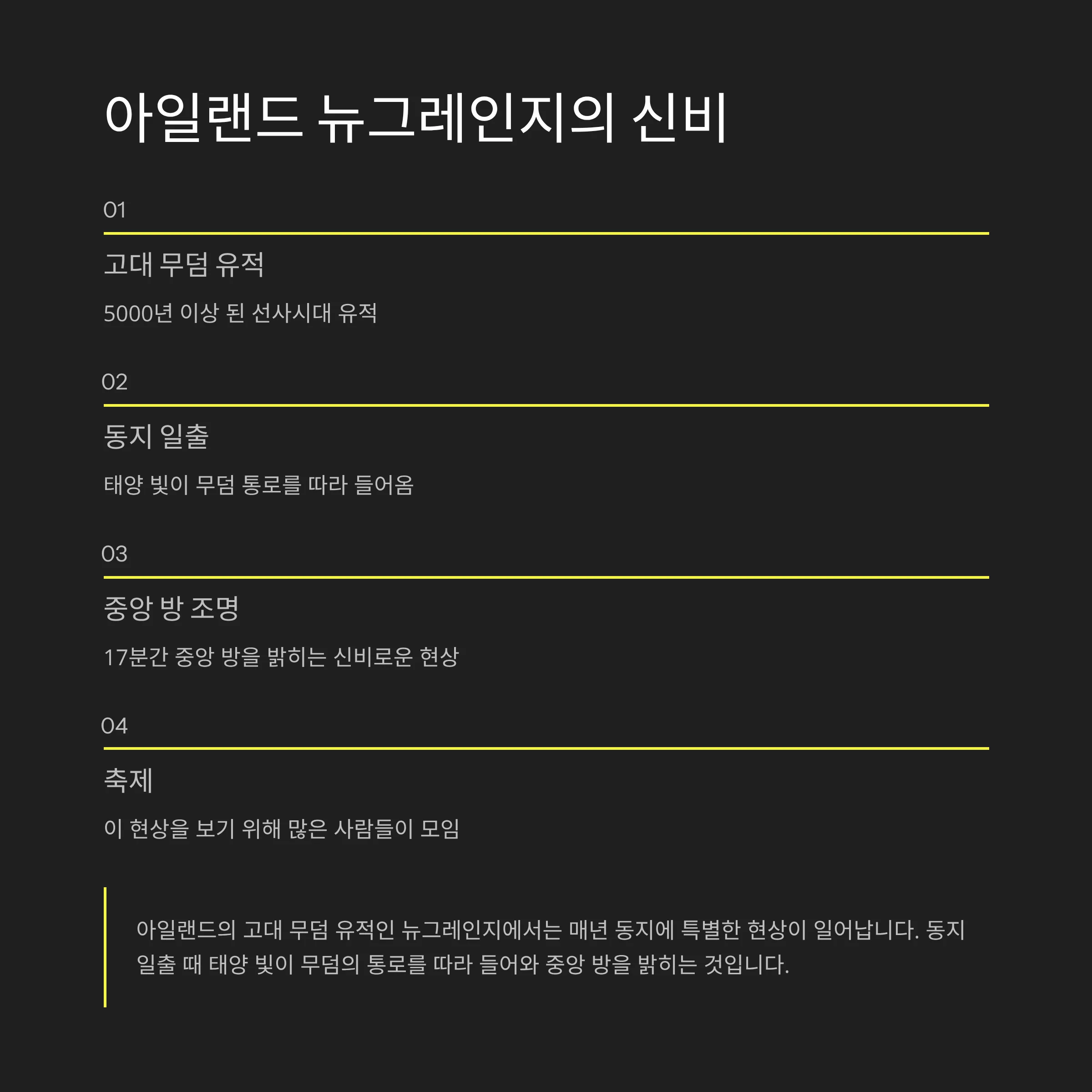 - 아일랜드: 뉴그레인지 고분에 동짓날 해돋이 빛이 비스듬히 들어오는 장면을 보기 위해 사람들이 모입니다.