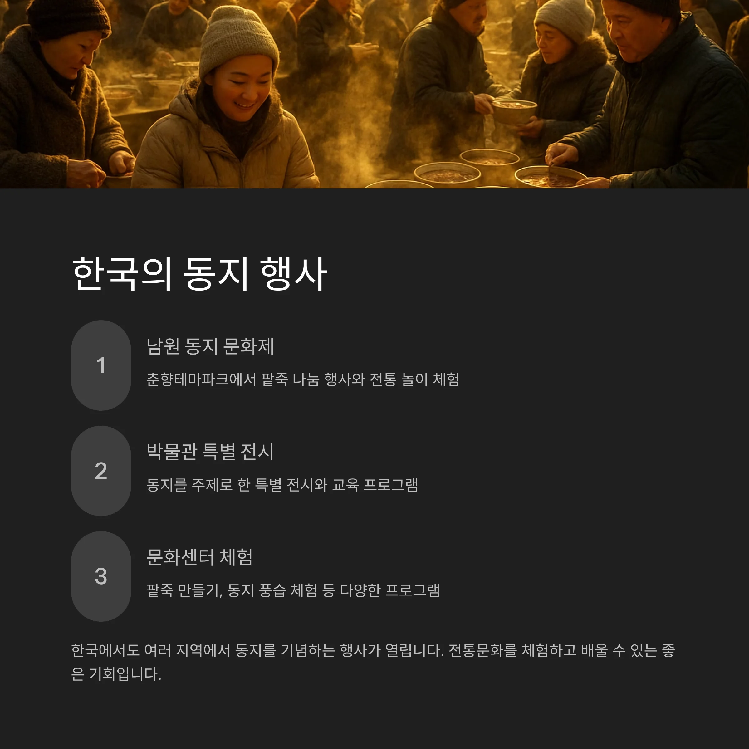 오늘날에도 많은 가정과 지역 축제에서 동지 팥죽 나눔 행사와 체험 프로그램을 통해 이 전통을 이어가고 있습니다.