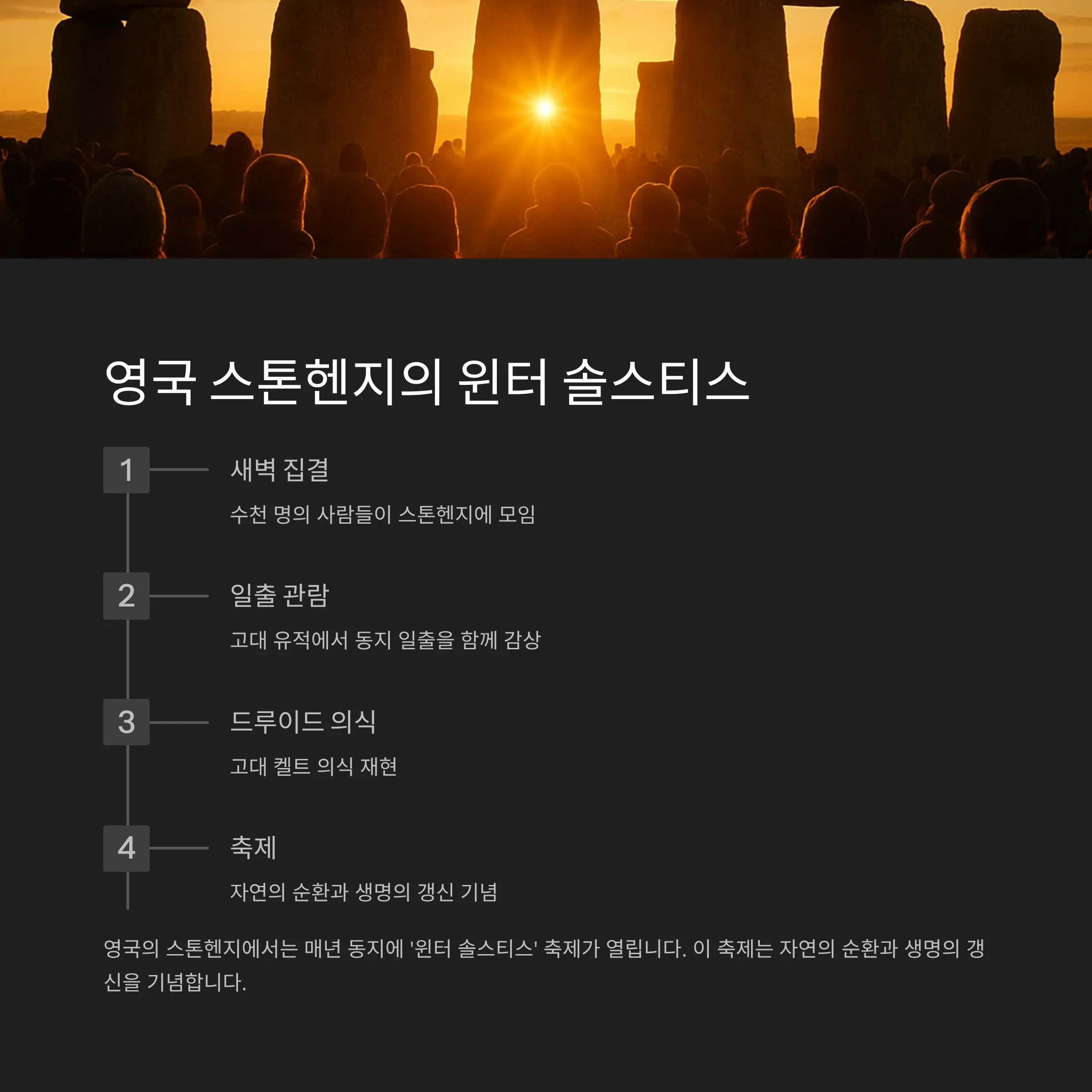 - 영국: 스톤헨지에서 동지 해돋이를 보기 위해 사람들이 모여 축제를 엽니다.