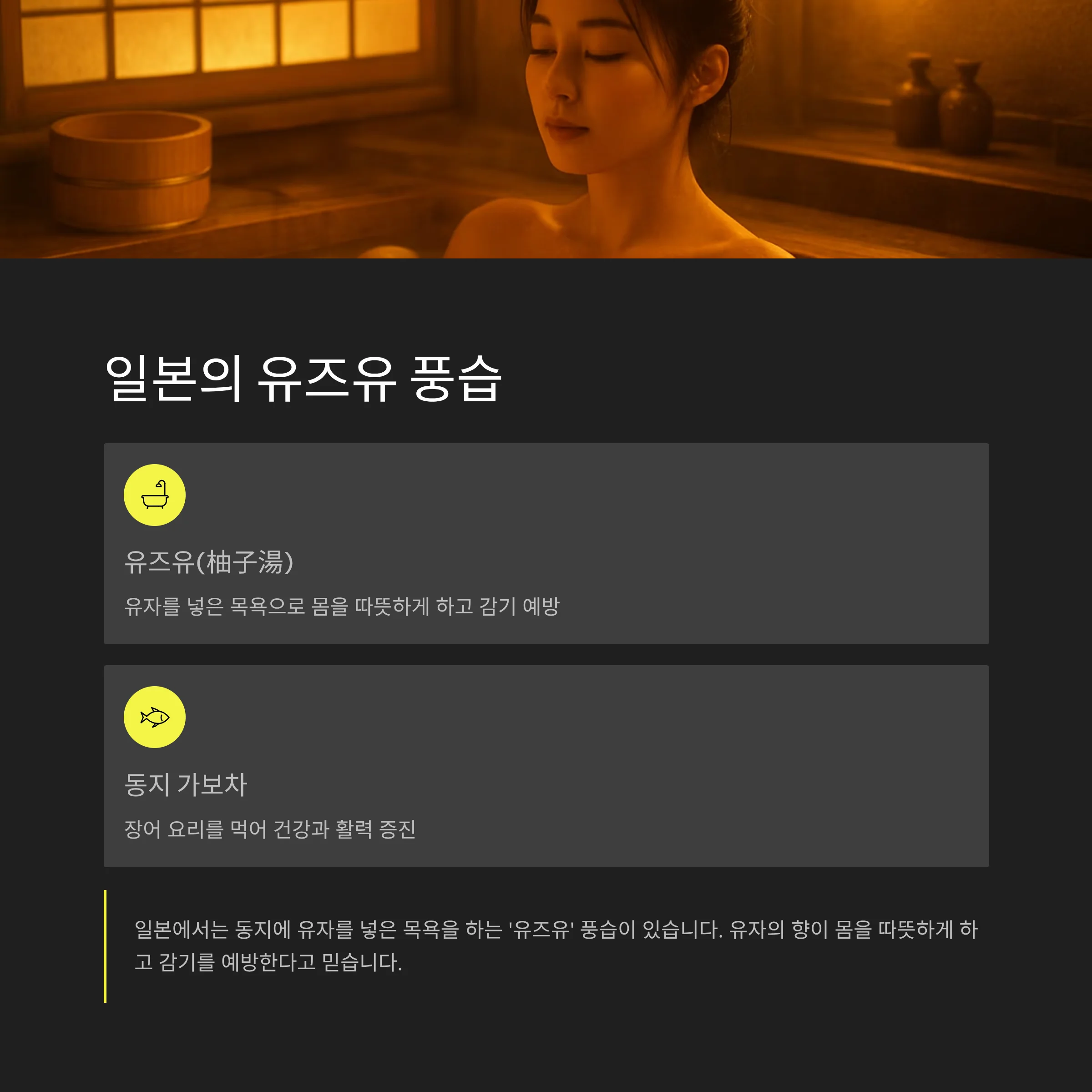 - 일본: 유자를 띄운 탕에 몸을 담그는 유즈유(柚子湯)로 건강과 액운 소멸을 비는 풍습이 있습니다.