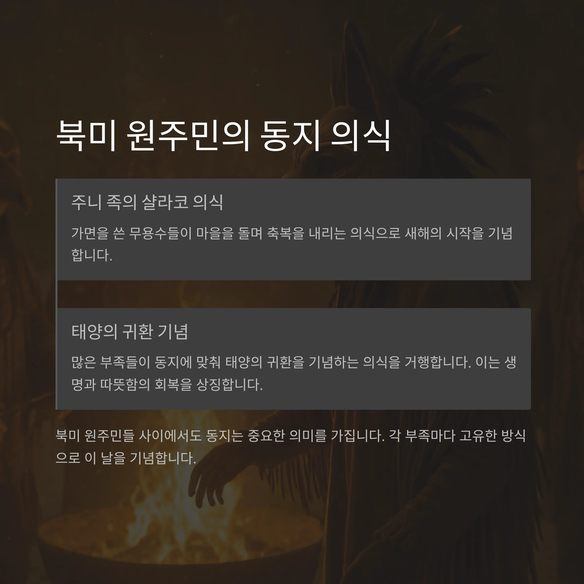 - 북유럽: 율(Yule) 축제를 통해 불을 밝히고 음식을 나눠 먹으며 긴 겨울밤을 이겨내는 의식을 치릅니다.