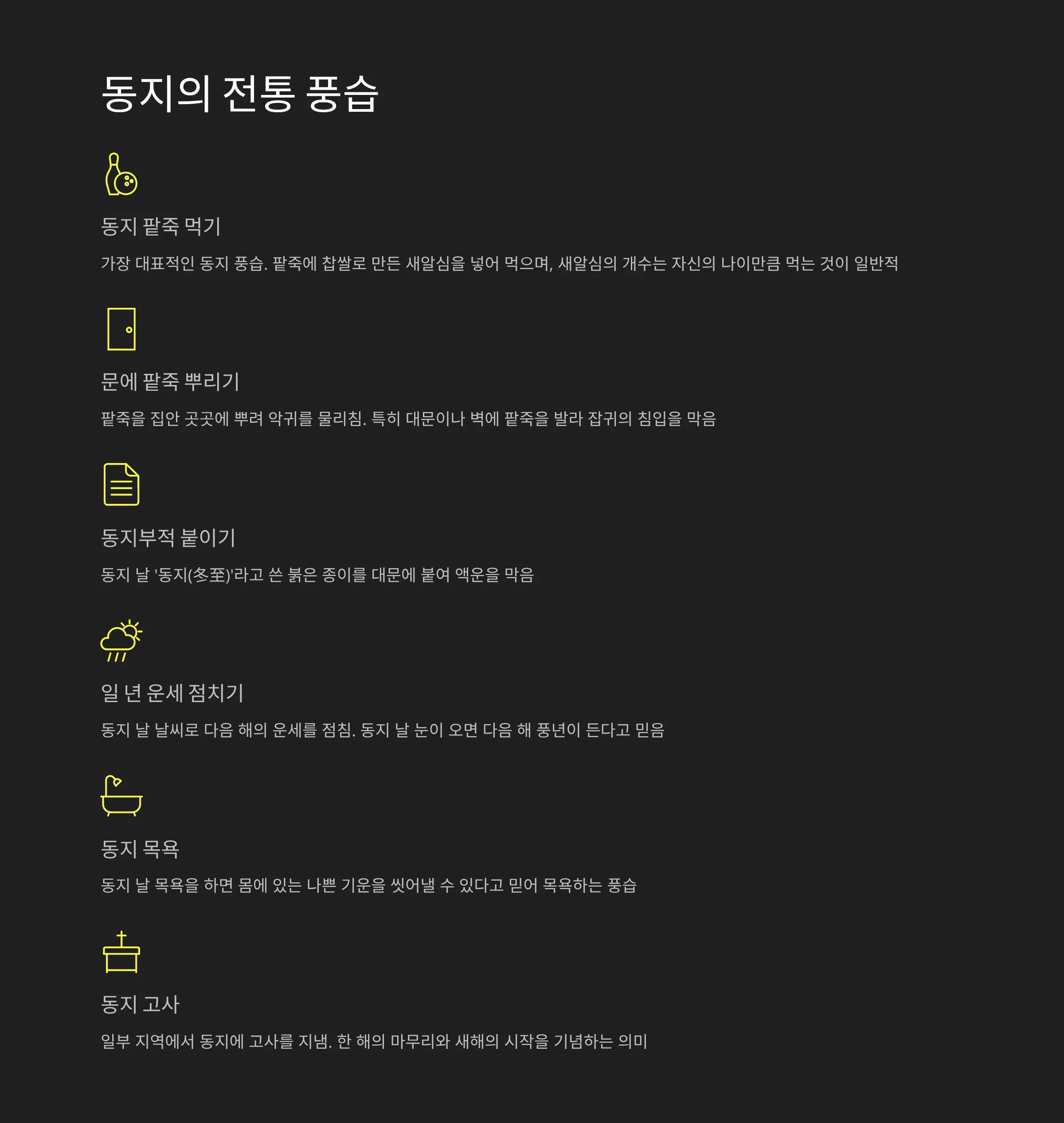 또한 동지에 ‘동지(冬至)’라고 쓴 붉은 종이를 문에 붙이는 부적 풍습, 동지 날씨로 다음 해 풍흉을 점치던 민간 신앙, 목욕으로 한 해의 묵은 기운을 씻어낸다는 풍습도 전해졌습니다.